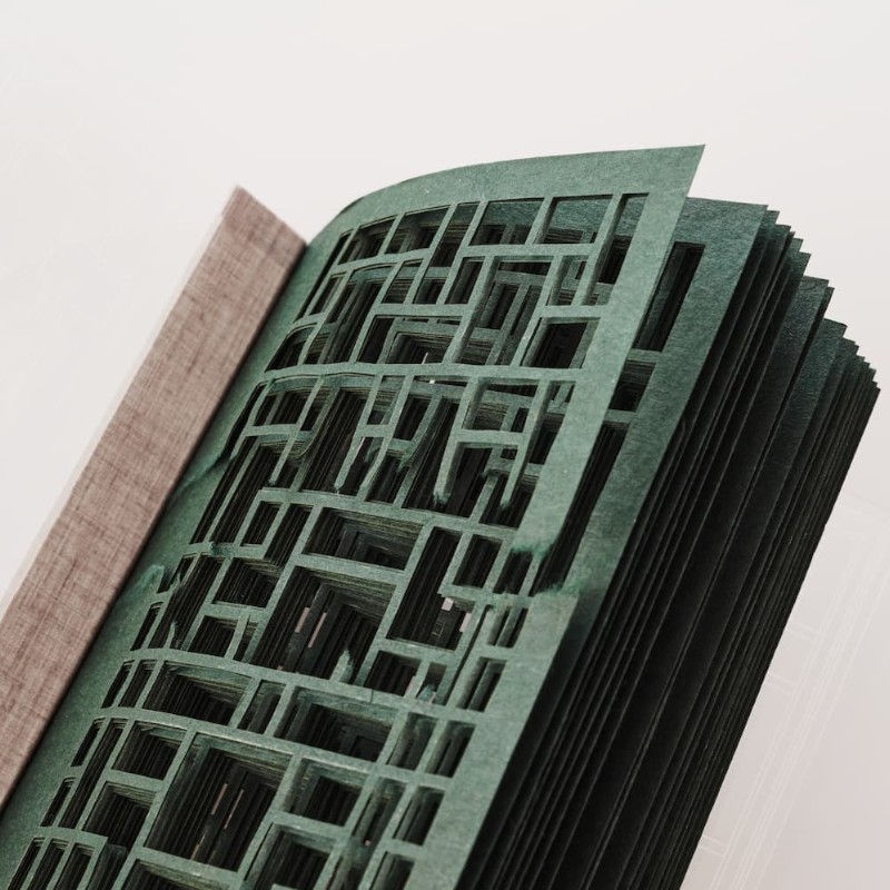 until the individual pages come together to shape a three-dimensional lattice door.