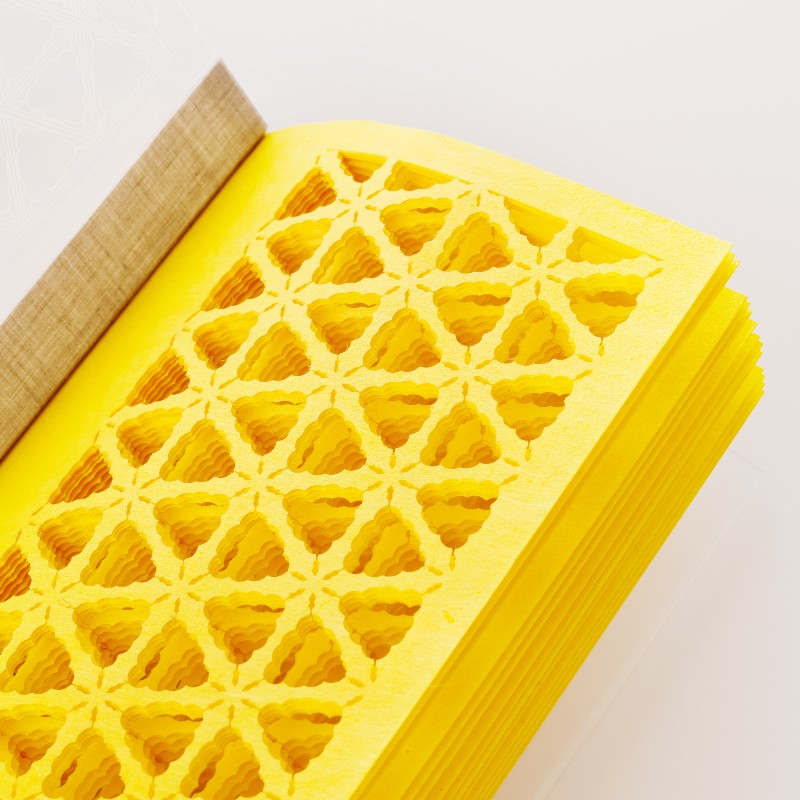 until the individual pages come together to shape a three-dimensional lattice door.